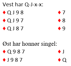 Så det er marginalt større sjanse for at det sitter Q-J fjerde foran, og følgelig er det litt bedre sjanse å starte med liten til tieren! Men husk, hvis tieren vinner stikket må du ikke bli overivrig å tro det er fem ruterstikk, men gi bort et stikk i andre ruterrunde.