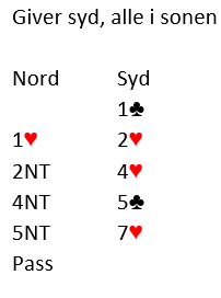 2NT var kun et spørsmål om det var tre eller fire trumf i støtte, og om det var en minimums eller maksimums hånd for 2H. Syd viste med 4 hjerter fire trumf og maks innefor 12-14 intervallet. På KeyCard Blackwood viste syd ett Key Card, og da jeg storeslemsinviterte med 5 NT syntes Faith hun hadde de riktige kortene og sa 7 hjerter selv om hun var litt bekymret for trumfen. Men 5NT hadde jo forsikret om at alle nøkkelkortene var på plass og at trumfen var god nok. Godt meldt? Kanskje...