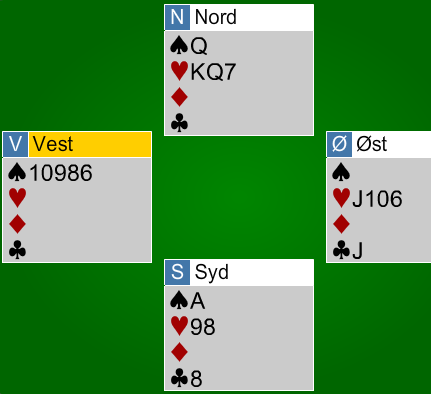 Øst må på dette tidspunkt holde tre hjerter og kløver knekt. Da kommer spar til syds ess, og øst er ferdig, enten må han kaste kløver knekt eller gi opp hjerteren.