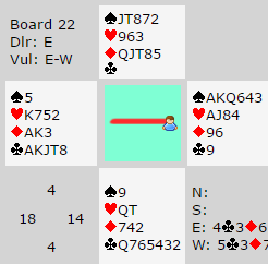 Mot oss hadde vest større ambisjoner. Etter at Faith hoppet inn med 3 kløver over østs 1 spar gikk vest litt berserk og stoppet ikke før 7 grand! Om den står er det nok litt flaksbetont. Det er enkelt om sparfargen sitter 3-3. Vår venn var ikke så heldig, og da han mistet kontrollen fullstendig endte det med tre bet.