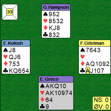 I finalen meldte Greco-Hampson 4 hjerter etter at øst hadde åpnet med 1 ruter. Syd doblet, og doblet igjen senere da øst kom tilbake med 2 kløver, og da nord over 3 kløver fra vest frivillig viste den anemiske hjerterfargen sin løftet syd til utgang. Som du ser er det tre minortapere i tillegg til vests trumfstikk. Men nord var spillefører, og etter kløver ess i utspill hadde Gitelmann et problem, han så ned på syds hånd som var blindemann, og den så skummel ut. Det er vel for de fleste en Lavinthalposisjon med esset ut og singelton i bordet. Vest la kløver 6. Etter en god del tenking la Gitelman ned ruter ess, og dermed var det +420 til N/S.