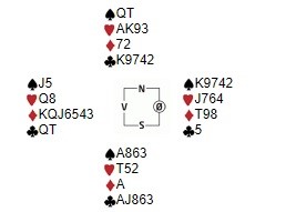 Christian (nord) åpnet med 1 spar, pass fra nestemann, og syd sa 2 spar som viste 5-10 hp (som regel eksakt trekorts trumf slik de spiller). Vest smalt til med 4 hjerter. Hva ville du meldt nå?