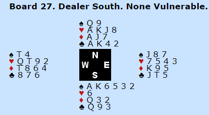 Etter å ha valgt riktig i et par spill hadde vi en misforståelse i ett spill og meldte en latterlig storeslem som nesten ikke hadde noen sjanse – en bet og tapt spill. I spillet etter satt jeg nord med disse kortene med syd som giver og ingen i sonen: