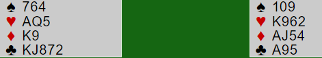 Ruter var ikke spilt tidligere og Syd trakk ru J fra bordet. Hva skal jeg gjøre? Fasit var at Syd ikke skal ha 2 stikk i ruter. Stikker du med ru D er det nok at makker i Vest har 9-er. Syd må da stikke med ru K og selv spille opp fra ru 10x eller ru 9x og vi får da to stikk. Bruker jeg esset og spiller opp ru 6 vinner Syd begge med ru K10 igjen.