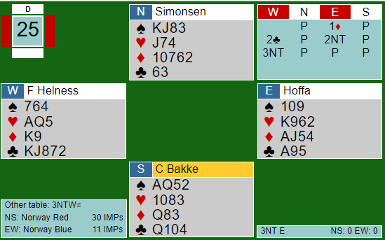 Allan Livgård satt Nord og åpnet med 1 kløver som Stig Dybdahl (Syd) svarte 1 hjerter (= 4+ spar!) på. Gjenmelding 2 NT fra Allan og 3 hjerter (5 spar) fra Stig før 3 NT fra Nord avsluttet. Imot satt Tom Gjøs (Øst)- Lars Helgesen (Vest), og Tom valgte uheldig hj D i utspill. Jeg hadde da 9 stikk (1+3+3+2) men fortsatt var det langt fram til det 10. Bordet hadde for eksempel altfor få inntak til gjentatte finesser i ruter (ru K kan være hos Vest). Allan stakk derfor med en gang med hj ess og spilte hj 2 mot bordet.Tom var flink og stakk med hj J og fulgte opp men ny hjerter. Jeg kom inn igjen og tok også for den 4. hjerteren med avkast av en ruter i bordet. Vest kastet nå ru 8, så da trodde jeg ruter konge satt bak. Da var det bare å prøve seg med ru 10 fra hånd, men igjen var Gjøs flink og stakk med kongen. Nå var det aktuelt sett best å bare fortsette i ruter (kanskje jeg selv skulle spilt ru A fulgt av ny ruter). Men Tom vred ikke unaturlig til spar 10 som seilte til min dame.