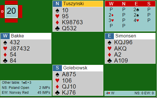 Hansen spilte ut kl D som ble dukket og kl J beholdt også neste stikk. Skift til spar der esset og deretter kongen tok de to neste. Men 3. runde spar ga Olav Erik sitt første stikk og trumf til liten og 10-er vant neste. Videre gikk det nærmest på skinner. Kl 4 felte kl A i Øst, ble stjålet av Syd og ny trumf gikk til A. Liten ruter fra Egil lurte ikke spillefører som brukte knekten. Da den dro esset i Øst var det «boka» men det 5. stikket til Øst- Vest ble det siste. +470 til Olav og Tommy og avansement på premiestigen mens Egil og Jørn fikk en lei smell og – 12 på spillet.