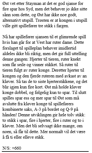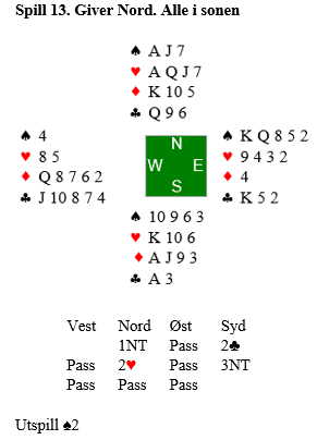 Allerede da nord fikk vite om syd sin ruterbeholdning visste han at 6 hjerter måtte være en brukbar slem, spesielt med syd som spillefører slik at spar konge var beskyttet i utspillet. 6 hjerter ble meldt med tannlegepresisjon!