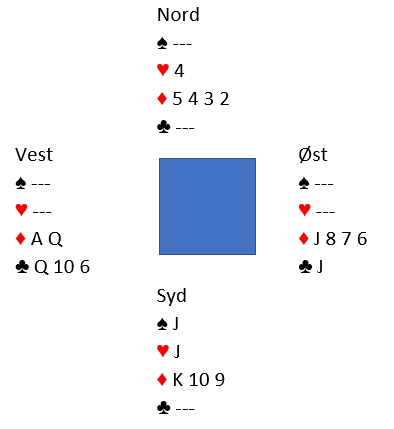 Merk at i denne sluttposisjonen ville spillefører vunnet 4 hjerter selv om vest sitter med AQJ i ruter! Men om det sitter slik kunne forsvaret betet kontrakten med ruter tilbake fra øst i andre stikk, dog ikke noe opplagt utspill da øst ikke vet at syd har singel kløver.