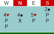 Til sammenligning kan fortelles at ved det andre bordet gikk meldingene 2 spar fra syd, 3 hjerter innmelding fra vest, 4 spar fra nord og dobler fra øst med pass rundt.