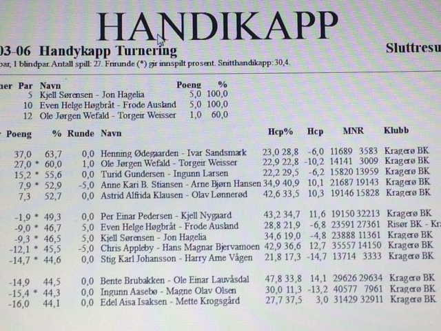 Kveldens vinnere ble Rolf A og Øyvind med Knut og Svein på andre, Tom Anders og Erik på tredje. Gratulerer!