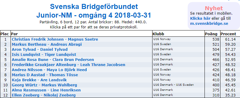 Sørreisa Bk arrangerte påskebridge onsdag 28.mars med 14 deltagende par.
