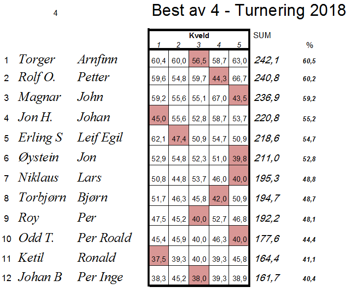 Det var jevnt før den siste runden, og laget med 3 x Eide (Harald, Erik og Lars) samt Håkon Kippe og Olav Lomsdalen snappet 1.plassen med den største seieren i siste kamp, av de som la an til å kunne vinne med en runde igjen å spille.