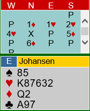 Som sagt så mange ganger før, utspill er ofte temmelig tilfeldig. Det kan vel her hende at hjerter ut er riktig, men Ø/V har neppe hjerterstikk å hente siden øst har ett ess ved siden av. Å håpe makker har noe særlig å bidra med noen steder er vel optmistisk? Så Johansen håpet kanskje at han skulle kunne få for trumfdamen og bete kontrakten med kløver ess, og han valgte hjerter ut som om ikke annet føles ganske "safe", du ødelegger i hvert fall ikke en eventuell dame hos makker i en av de sorte fargene.