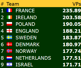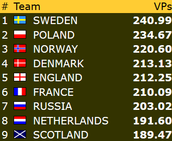 Spillefører stakk med esset, tok 2 runder spar, spilte hjerter til kongen og kastet bordets siste hjerter på spar 10. Nå var det bare å stjele en hjerter med kløver dame, og trekke ut trumfen for 12 stikk og 920 til Sverige.