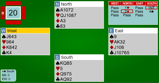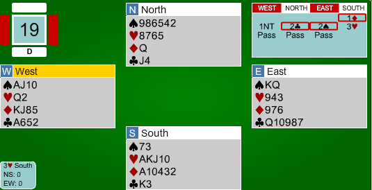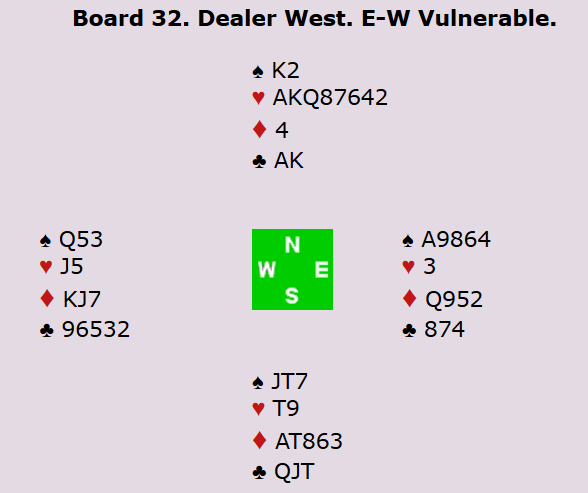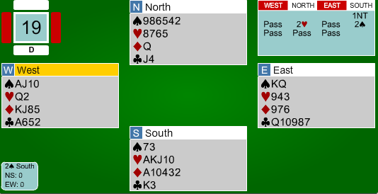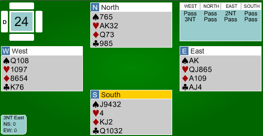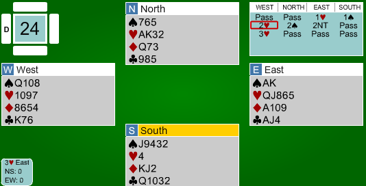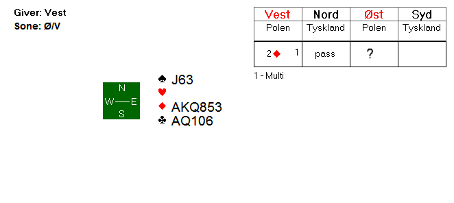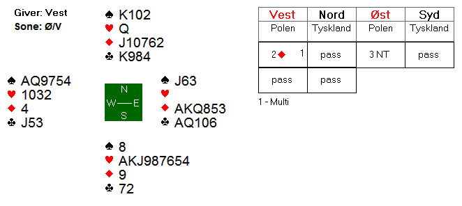 I åpent rom valgte Vest å åpne med 1 spar, Ann Karin Fuglestad passet og Øst svarte 1 grand. Da Marianne Harding så gikk innpå med 2 hjerter viste det nok solid 5+ farge men max ca 15 hp. Vest passet og Nord hoppet til utgang. Men der døde det naturlig ut. Utspill ru J og med aktuell sits ble det 13 stikk.