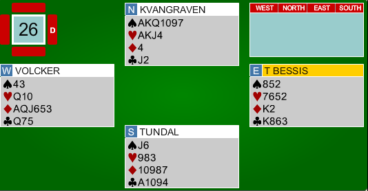 I lukket rom startet Lengy med 1 hjerter, Boye Brogeland meldte da 2 hjerter, Michael med spar og minorfarge, Bareket 3 hjerter men så likt og Espen Lindkvist ble spillefører i 4 spar.