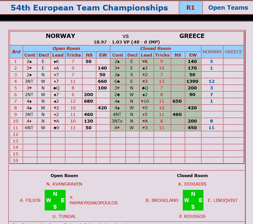 Ved det andre bordet hadde grekeren åpnet med 1kl på Espen sine kort, og da kom de bare i 3NT og dermed 12 IMP til Norge.