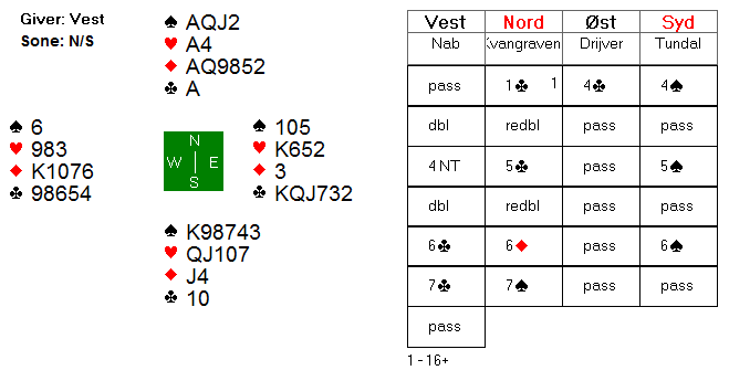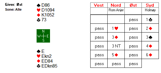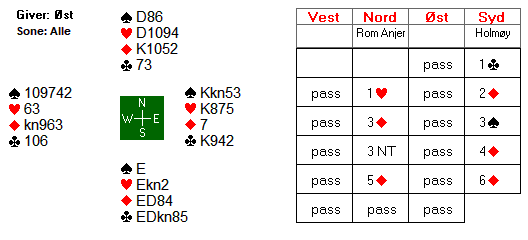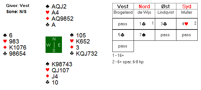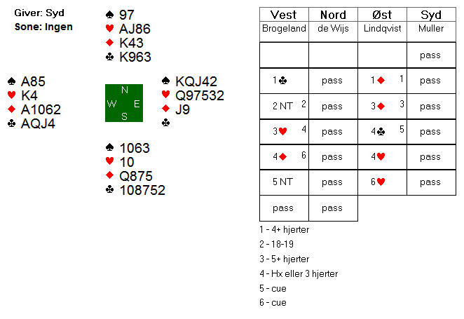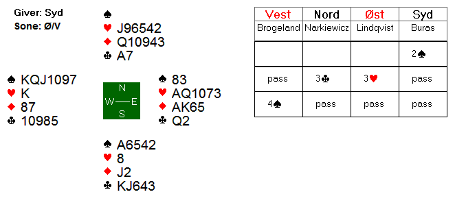 Spillet gikk ut ved det andre bordet, der kløver dame falt under esset uten at spillefører brukte en høy kløver fra bordet, og det ikke var noe problem å få tak i 4 kløverstikk.