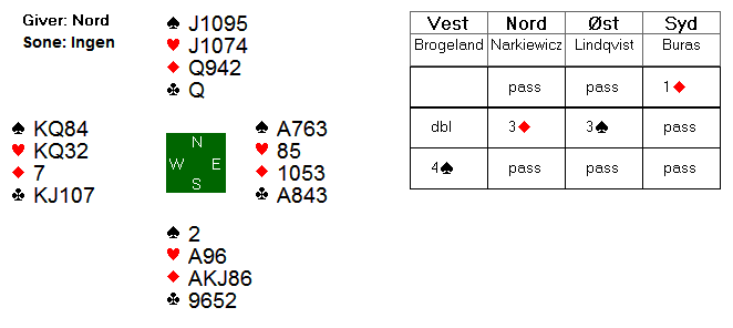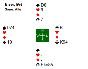 Syd spilte ut ruter ess og skiftet til kløver 6. Espen la knekten i bordet, og stakk damen med esset. Så fulgte en hjerter til kongen som stod, spar til esset og en ny hjerter mot bordet. Syd stakk med esset og fortsatte med liten ruter til stjeling i bordet. Espen tok for spar konge, som avslørte at sparen satt 4-1. Han fortsatte med spar dame, før han kastet sin siste ruter på bordets hjerter dame. Posisjonen var nå som følger:
