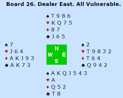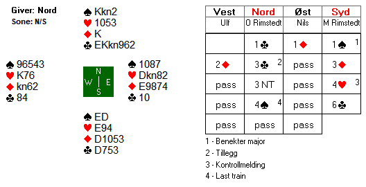 Mot Molander (Ø)- Lian (VS) åpnet Nord med 2 hjerter, svake 2, og Knut doblet opplysende. Syd passet merkelig nok (hadde 5- kort bra hjerterfarge) og May Liss hoppet til 3 grand, 12 hp+ og sikkert hold i hjerter. Da tok Knut sats og hoppet til 6 ruter! Bare ett par til kom så høyt, det var Hildur Rostad- Hanne Rostad med topp for 6 grand. Med den supre tilpasningen ble det 13 stikk. 7 NT og 7 spar vinnes også.