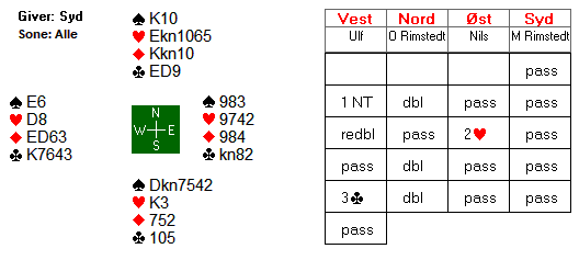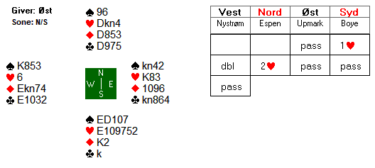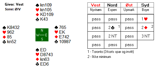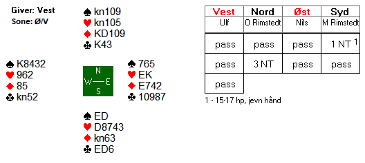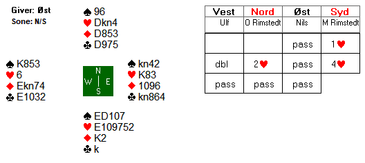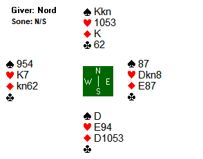 Arne Marthinussen og makker fant beste utgangskontrakt. Der passet Anne Langgård (N), Arne åpnet med 1 ruter, Herlov Langgård (S) gikk innpå med 1 hjerter og Vest krevde med 2 hjerter. Da Nord hoppet direkte til 4 hjerter tok Marthinussen med muligheten for sparkontrakt, og 4 spar fikk stå for 13 stikk. Mye bedre score enn utganger i ruter de fleste kom i.