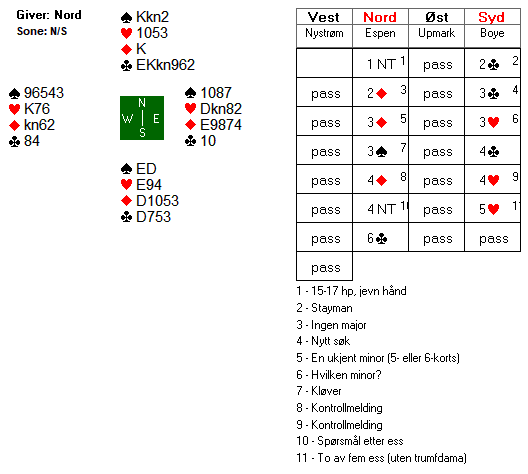 I lukket rom åpnet Lindkvist imed 2 kløver, Brogeland svarte 2 ruter og Øst gjenmeldte 3 kløver, fikk svar 3 ruter men på 3 NT inviterte Boye med 4 kløver og via kontroll 4 ruter ble 5 kløver løftet til lilleslem, 6 kløver. Her var hj AD beskyttet og 12 stikk bombesikert hjemme for +12 imp.
