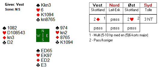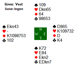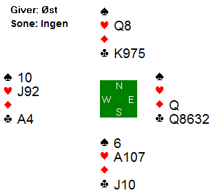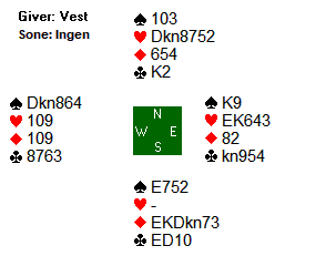 Så spilte vest en kløver mot bordet, og Espen la liten i tempo, og spillefører la liten, slik at knekten i syd tok stikket. Boye kunne nå spille liten hjerter tilbake, før Espen innkasserte de to siste stikkene for K9 i kløver over bordets Q8. 300 ga Norge 6 imp, mot 1NT med en beit på andre bordet.