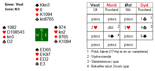Nord forklarte derimot 2NT som en god løft til 3 kløver til øst. Vest har dermed fått feil forklaring, så spørs det hva makkerskapsavtalene til NS egentlig viser. Halve salen har meldt utgang, så det er håp om at Norge kan få en korrigering og dermed flere IMP!