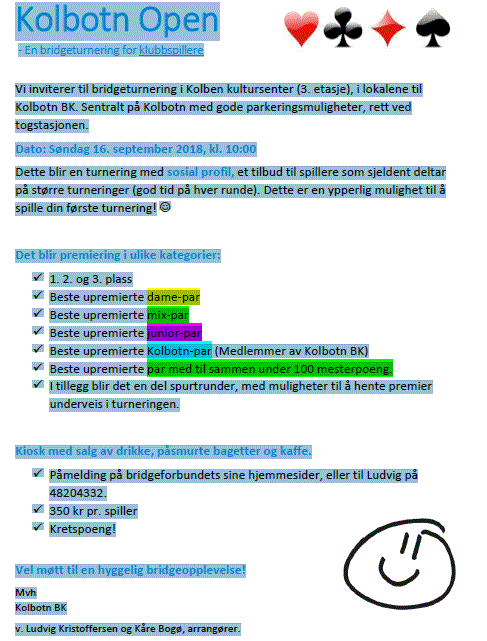 Espen valgte å åpne i 2 kløver på hånden i nord, og da ble det vanskelig for motparten å komme inn. Øst meldte inn 2 ruter, men etter systemet viste dette 4+ spar + en minor. Øst hadde glemt dette, og vest fant aldri ut hvilken minor makkeren hadde, og Espen fikk spille 4 spar for 10 stikk og +620.