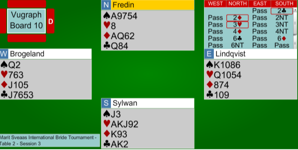Syd sin hånd med bare 10 hp er likevel med to spillesterke majorfarger meget spesiell. 5 av 8 bord åpnet Syd med 1 spar. Ved de andre ble det avventende pass. Det går jo aldri pass rundt med slike fordelinger. Etter pass fra Vest også hadde Nord en klar 1 NT- åpning, men nå ble det mer vanskelig å nå høyt nok. Syd overfører til spar (2 hj= 5+ spar) og Nord er ikke god nok til hopp i spar. Over 2 spar kan Syd så hoppe til 4 hjerter for å vise minst 5-5 i majorfargene, men da er det ikke enkelt for Nord å gå mot slem.