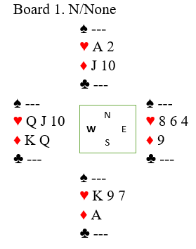 Jeg sa nesten, for du ser vel den ene feilen i dette diagrammet? Vest har igjen ett kort mer en de andre, og det er fordi han ennå ikke har kastet på den femte sparen. Hvis han kaster en hjerter vinner spillefører tre hjerterstikk til slutt, og hvis vest kaster en ruter kan spillefører tar for ruter ess og felle den siste ruteren og bruke hjerter konge som inntak til å hente godspilt ruterstikk. Men det satt ikke helt sånn, og kontrakten gikk bet etter at vest var flink og unngikk ruterutspill som ville forært spillefører kontrakten.