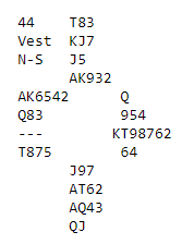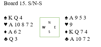 Spillefører måtte kaste kort fra øst idet han spilte god hjerteren, og etter hvert fikk han kastet alle østs kløver samt en spar han ikke trodde han hadde bruk for, og det ble etter det godspilte stikket for den femte hjerteren kun to ruter igjen hos øst, og det var den lekre finessekombinasjonen Q-7! Og det er vel bedre å spille på den finessen enn at sparfargen sitter 3-3? Spillefører tok sidestikkene siden inkludert kløver ess. Med to kort igjen spilte han liten ruter fra vest og ba med stø røst om syveren fra øst, men da ramlet taket i hodet på han. Slik så hele spillet ut fra start: