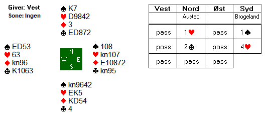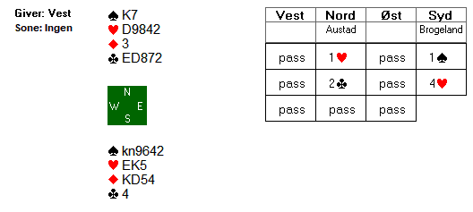 Marius Dalemark Austad (15) ble spillefører i 4 hjerter på et av spillene og hadde følgende ressurser til rådighet:
