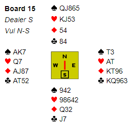 Til slutt valgte han å ta finessen, og med den aktuelle sitsen ga det 12 IMP til svenskene. Kanskje ikke helt urimelig i og med at nord er markert med maksimalt fire poeng i hjerter, ruter og kløver. Ville han støttet til 2 hjerter med så lite som 4 hp i form av to knekter og ei dame?