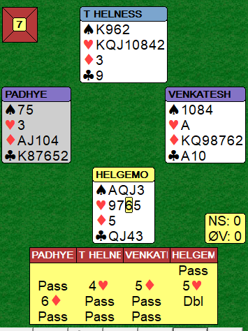 En liten hjerter fra øst gikk til tieren og damen, så liten hjerter fra begge hender og esset kom «på luft». Ti stikk og 620 ga sammen med -100 ved det andre bordet 11 IMP til ZIMMERMANN.