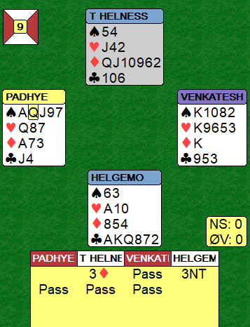 Der Tor og Geir satt N/S åpnet øst med 3 grand, og uten å vite noe om den fantastiske tilpasningen sa vest bare 4 spar. Det var tolv enkle stikk i spar, og ser ut som det kan bli tretten, men siden kløveren sitter så skjevt får ikke spillefører både kastet sine hjertere og trumfet nok rutertapere. Spillefører fikk tolv stikk, +480.
