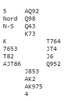 I Jotun lagturnering meldte ett par lilleslem i spar, resten var i utgang. Det er vel kanskje ikke slemmelderne så stolte over, det er ikke bra nok sjanser til at dette er en god slem. Dessuten mangler det 2 Key Cards, så uansett hvem av N/S som eventuelt spør om antall Key-Cards kan svaret bety at det mangler to ess! Men den virkelige definisjonen på en god slem er at den står! Og da spillefører løste sparfargen uten taper ble det et fett pluss-spill, +1430!