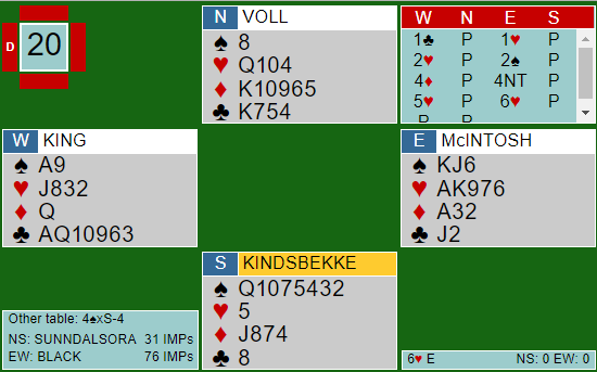 Mot Kindsbekken-Voll stod det engelske paret på og de endte i en hardmeldt, men bra slem. Den avhenger av at hjerteren løser seg uten taper, eller at kløverfinessen går. Det satt ikke som Ø/V håpet, og N/S noterte seg for en bet. Ved det andre bordet ble det enda mer drama: