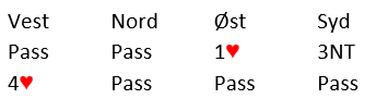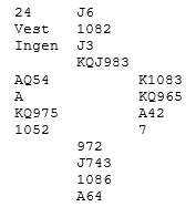 3 grand var en populær innmelding, og de fleste fikk spille den kontrakten. Der var det ni sikre stikk, forsvaret kan ikke ta mer enn tre sparstikk og hjerter ess, og mange fikk overstikk i N/S sin utgang. Siv Thoresen-Tolle Stabell noterte +430 for lederlaget.