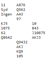 Som du ser er 4 spar en mye bedre kontrakt, men det er ganske naturlig å komme i 3 grand slik det fleste har definert sitt system. Kun ett par i disse fire puljene meldte 4 spar, Ole Berset og Bjørn Olav Ekren. Siv Thoresen og Tolle Stabell var i 3 grand og noterte +690 etter hjerterutspill fra vest.