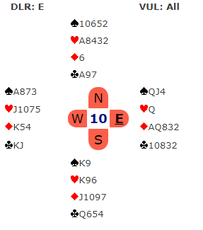 Vel, det vet vi ikke. Men om vi blir spillende i 5 kløver, kanskje doblet, kan de hente +500 ved å spille ruter ut til esset, ta en ruterstjeling, spille hjerter til vest før det derfra kommer enda en ruter som forfremmer trumfkongen til det fjerde motspillstikket.
