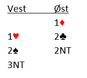 La oss si du sier 3 ruter, en kraftig reversmelding siden det er på tre-trinnet etter kun en-over-en fra makker. Det går 4 hjerter fra venstre, pass fra makker og nestemann. Din tur, melder du igjen?