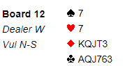 Ved det andre bordet meldte N/S 5 kløver og mine lagkamerater stampet i 5 hjerter som ble doblet, 300 i bet etter klølverutspill og det fine motspillet som forfremmer syds trumf dame. Det ga et 12 IMP bidrag til vinnerlaget på sin vei mot en overbevisende triumf.