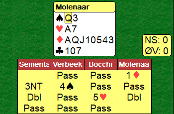 Nord kom inn. Sparen satt som ventet 4-3 fra start så nord kunne ikke ta mer enn to sparstikk i alt før han måtte spille kløver. Det betyr at nord fra start hadde fordelingen 4-3-1-5, noe som øker sjansen for at kløver dame er hos han sammen med fem kløver heller enn hos syd som hadde bare to kløver fra start. Idet kløveren kom fra nord la Lauria liten fra hånden, men da stakk syd med damen og kunne ta en bøtte med ruterstikk, to bet!