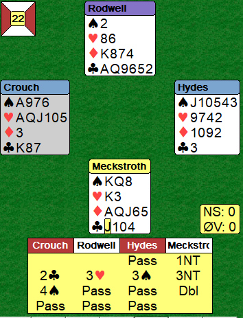 Som du ser hadde Crouch større ambisjoner som vest og meldte 4 spar da makkeren var med på tre-trinnet etter at nords 3 hjerter hadde vist kløverfarge og krav til utgang. Meckstroth doblet 4 spar, men den føk hjem i røyk og damp! Pluss 790 var sammen med resultatet fra det andre bordet verd hele 15 IMP.
