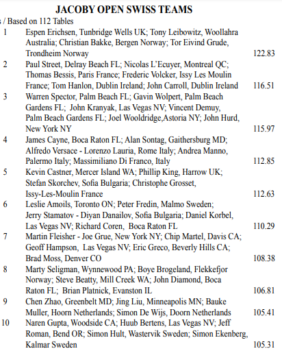 Lag WOLFSON som slo ut Grude, Bakke, Erichsen og Leibowitz tok seg senere helt til finalen hvor de skulle opp mot NICKELL som nok måtte få favorittstempelet i den kampen. Men 17. seedede WOLFSON vant finalen med spillerne Jeffrey Wolfson, Steve Garner, Michael Becker, Michael Kamil, Peter Crouch og Alexander Hydes.