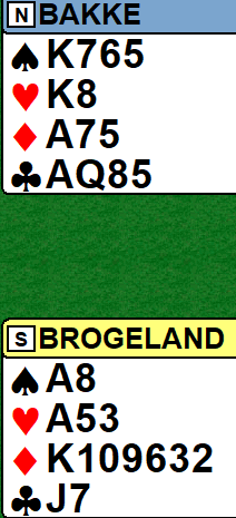 En god lilleslem i ruter ble meldt de fleste steder, også av Brogeland-Bakke. Det så ut til at runden mellom de to norske parene skulle ende omtrent uavgjort, men så fikk Bakke inn et kanonspill.