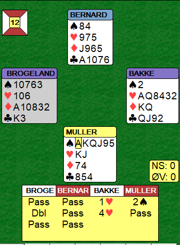 Her var ruter ut fryktelig for forsvaret, spesielt da nord brukte kongen som kostet stikket hans i den fargen (å legge kongen kan være riktig om ruteren ser ganske annerledes ut ). Bakke stakk nords ruter konge og spilte liten kløver. Syd tok for kongen og spilte mer ruter til vests tier. Da fulgte en frekk liten hjerter fra vest, og nord la liten slik at knekten dro esset. Spillet var fullstendig ødelagt for N/S, og Bakke endte med 11 stikk!