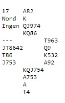 Av åtte N/S-par som meldte slem var det kun tre som vant den. De som vant slemmen spilte den fra nord sin side. To av dem fikk det enkelt etter kløver ess ut, og den tredje som vant slem fikk liten trumf ut og vant første stikk med åtteren. Da kunne en hjerter trumfes lavt og en med esset uten at øst får trumfstikk.