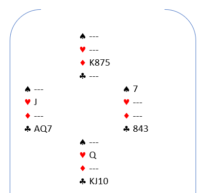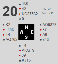 Min lagkamerat fant altså den vinnende meldingen, men dessverre kludret han det til i spilleføringen og gikk bet, -100. Ved det andre bordet spilte vi 3 ruter med +110, uavgjort spill.
